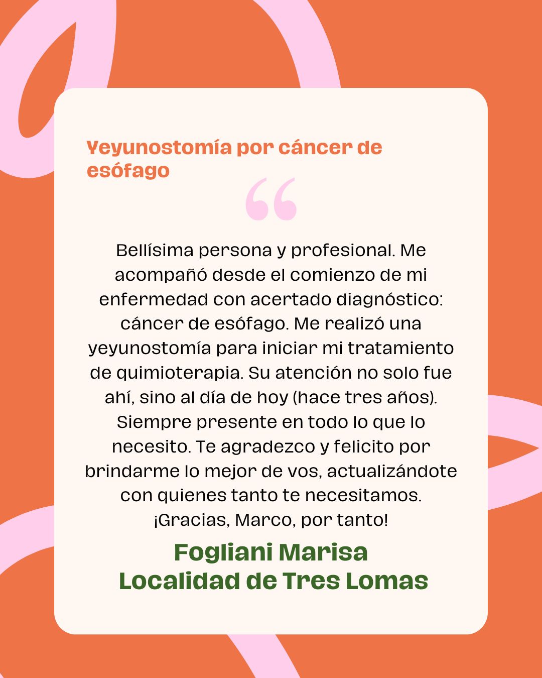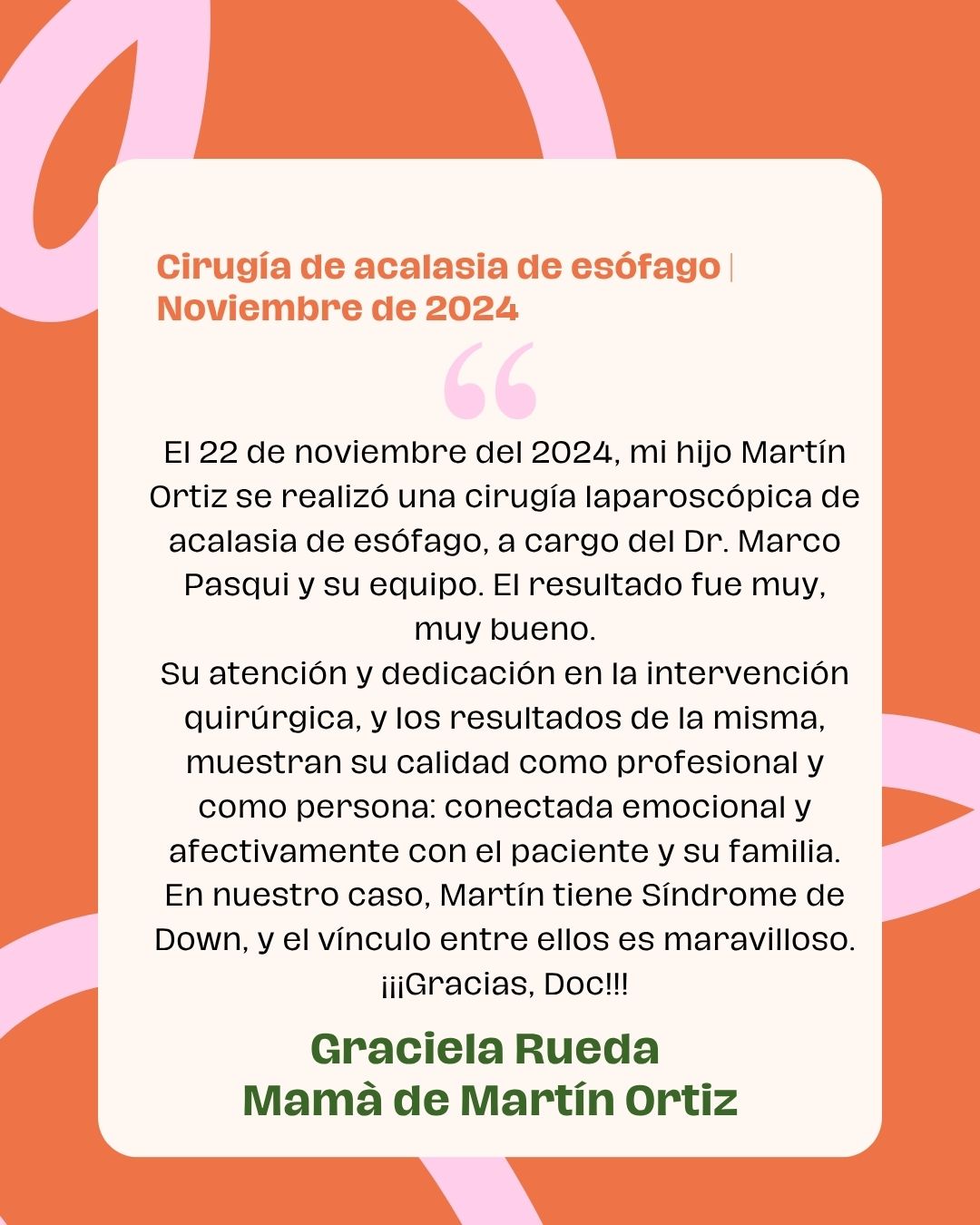 Quiero destacar el factor humano y profesional del Doctor Marco Pasqui que en todo momento me atendió con una gran calidez humana, brindándose en todo momento más allá de las obligaciones médicas para,saber ayudar y contener a mi familia en los peores momentos que tuvimos que pasar.